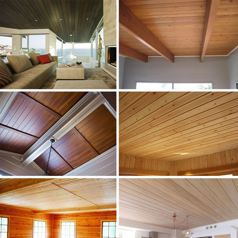 Можно использовать данный материал и для декорирования построек из других материалов. При этом, необязательно зашивать всю поверхность потолка подобными досками – можно выделить часть поверхности, придав ей особенный вид. Используя морилки и лаки, можно выделить структуру древесины или просто покрасить поверхность, что дает множество возможностей для формирования общего дизайна помещения.
