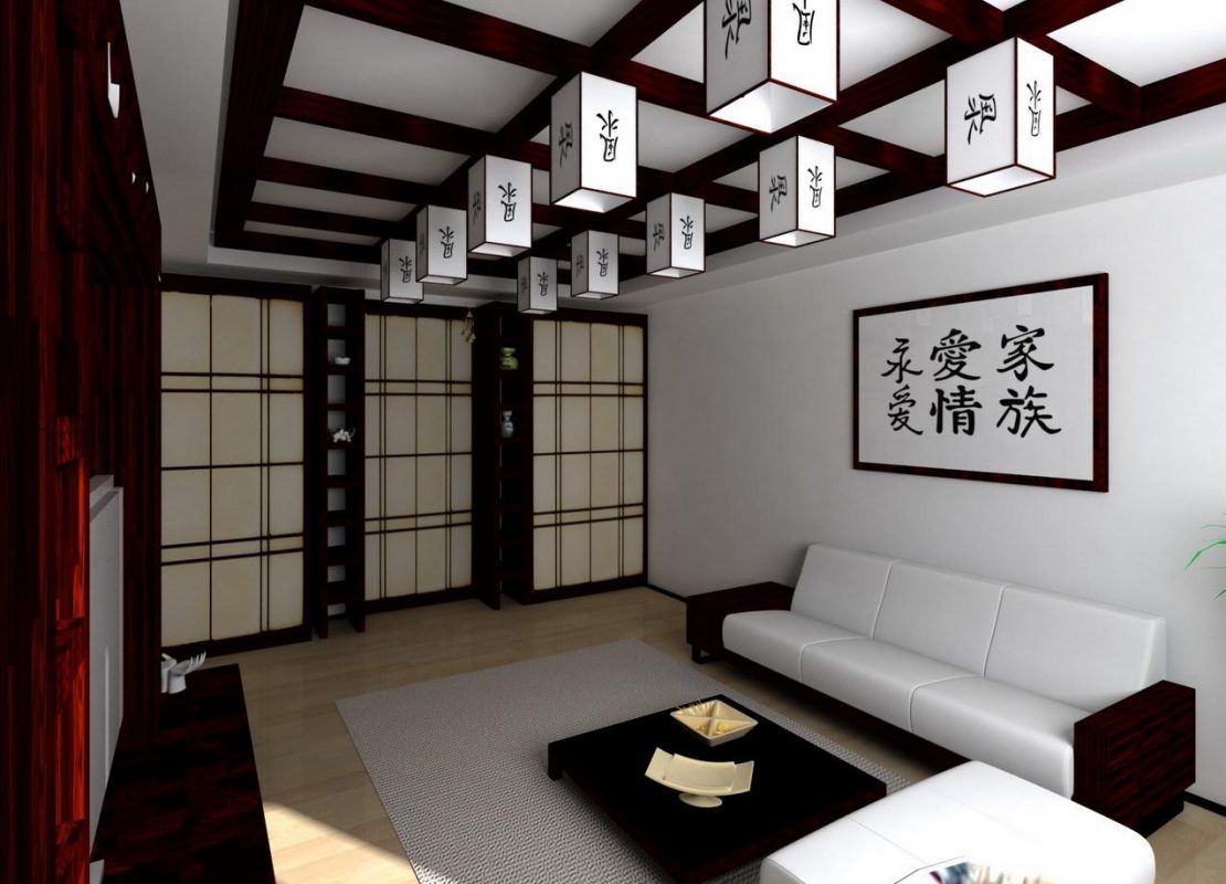 Оригинальный грильятый потолок из деревянных реек будет уместен в интерьерах в японском стиле. Планки из темной благородной древесины подчеркнут строгость и лаконичность этого стиля.