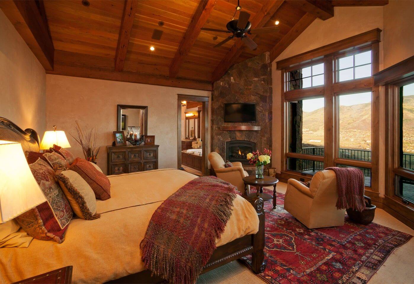 Отличным решением для стен станет фактурная штукатурка, она передаст натуральность и естественность. В такой спальне очень нужен камин. Стены и пол рядом с ним можно оформить камнем, а также сделать кирпичные вставки в на стенах.