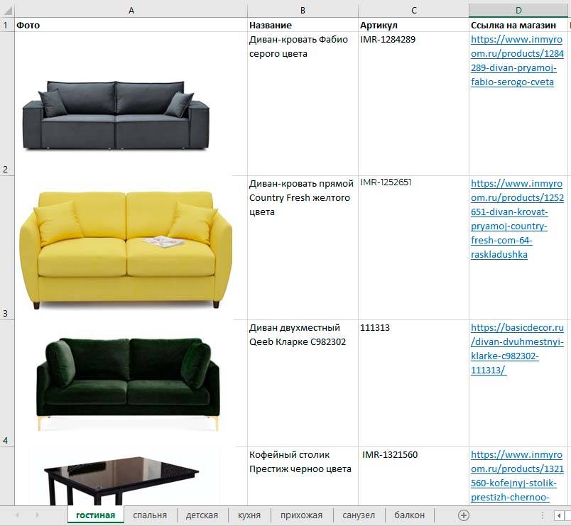 - Вести таблицу предметов интерьера со ссылками на магазиныСсылки помогут купить предмет интерьера, который изначальноподбирался для визуализации. И сохранить деньги, держась в рамках бюджета