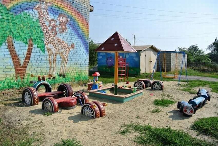 Если детская площадка будет делаться из покрышек, на ней могут быть качели, привязанные к деревьям, клумбы, фигуры животных и даже горки.