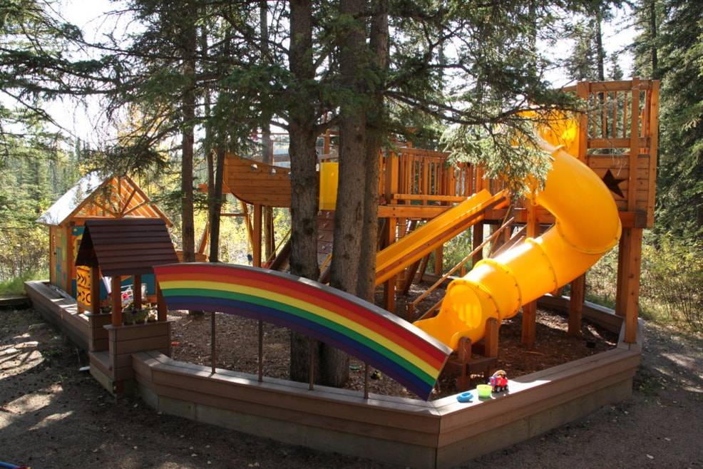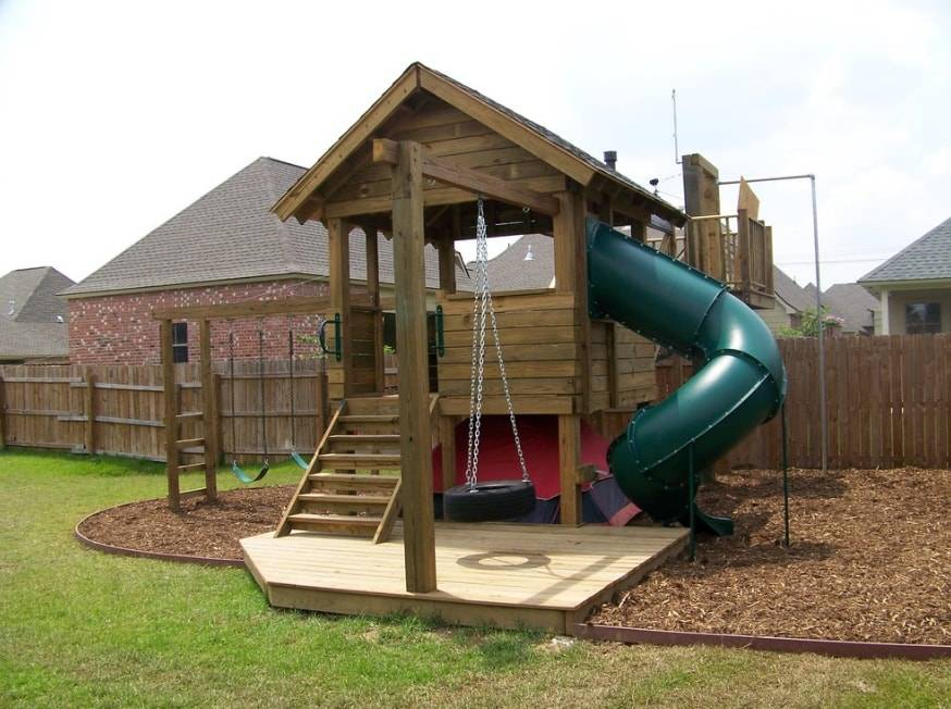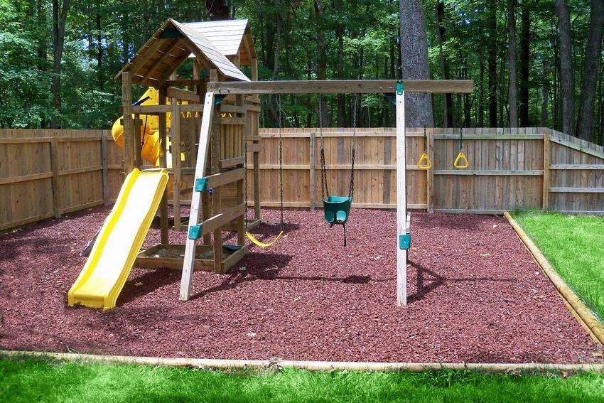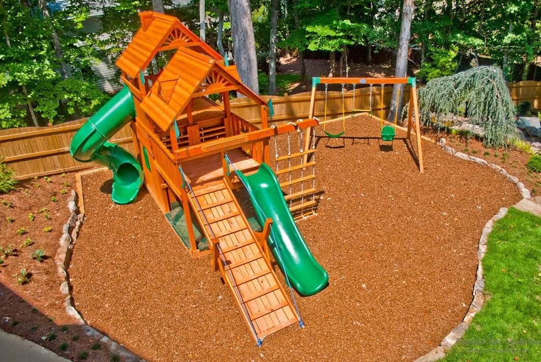Также очень важно думать о правилах безопасности во время выбора и установки специального оборудования. К примеру, если планируется использование деревянных элементов, то проследите за тем, чтобы они были хорошо отшлифованными и покрытыми лаком. Качели и горки не должны быть с острыми углами или торчащими болтами
