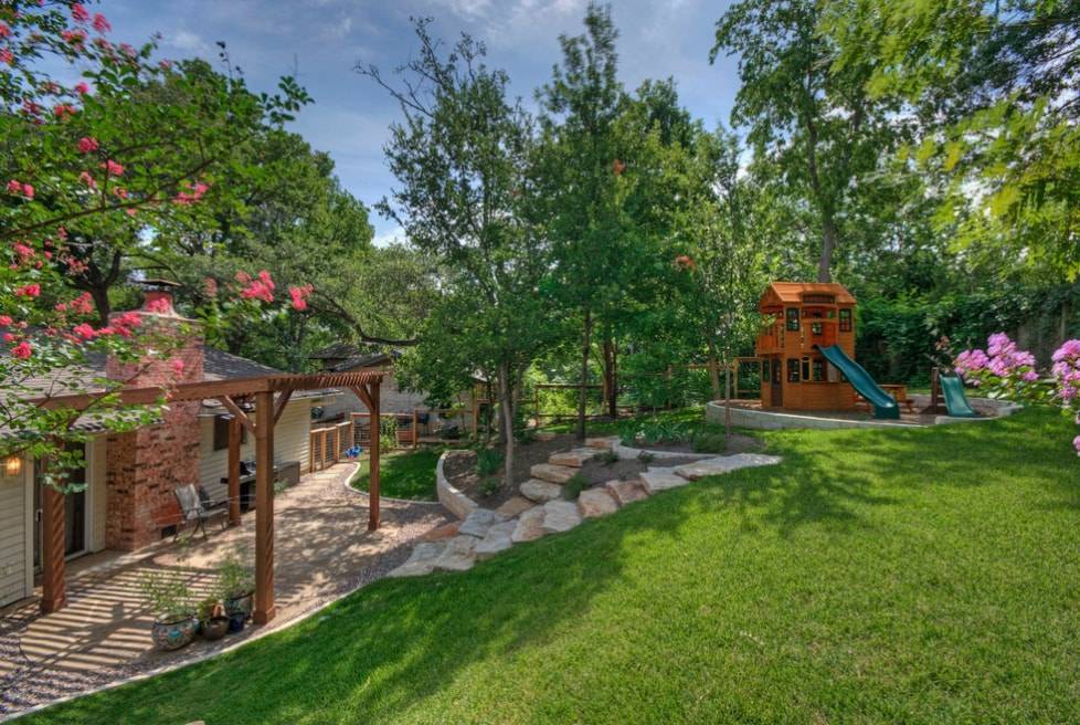Это сложная тема с совсем нелегким выбором. Пока дети маленькие, им отлично подойдет газон. Не парадный, а спортивный (есть специальный состав трав с высокой стойкостью к истиранию). Он не такой привлекательный внешне, но способен вынести маленьких проказников почти без повреждений. Недостаток газонов — необходимость регулярного ухода: полив, стрижка и т.п.