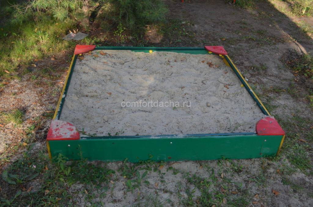 песочница, с высокими бортами и обустроенной зоной отдыха, важно следить, чтобы песок не промокал и не загрязнялся;