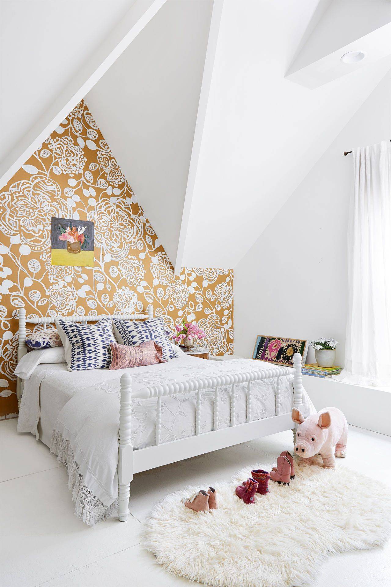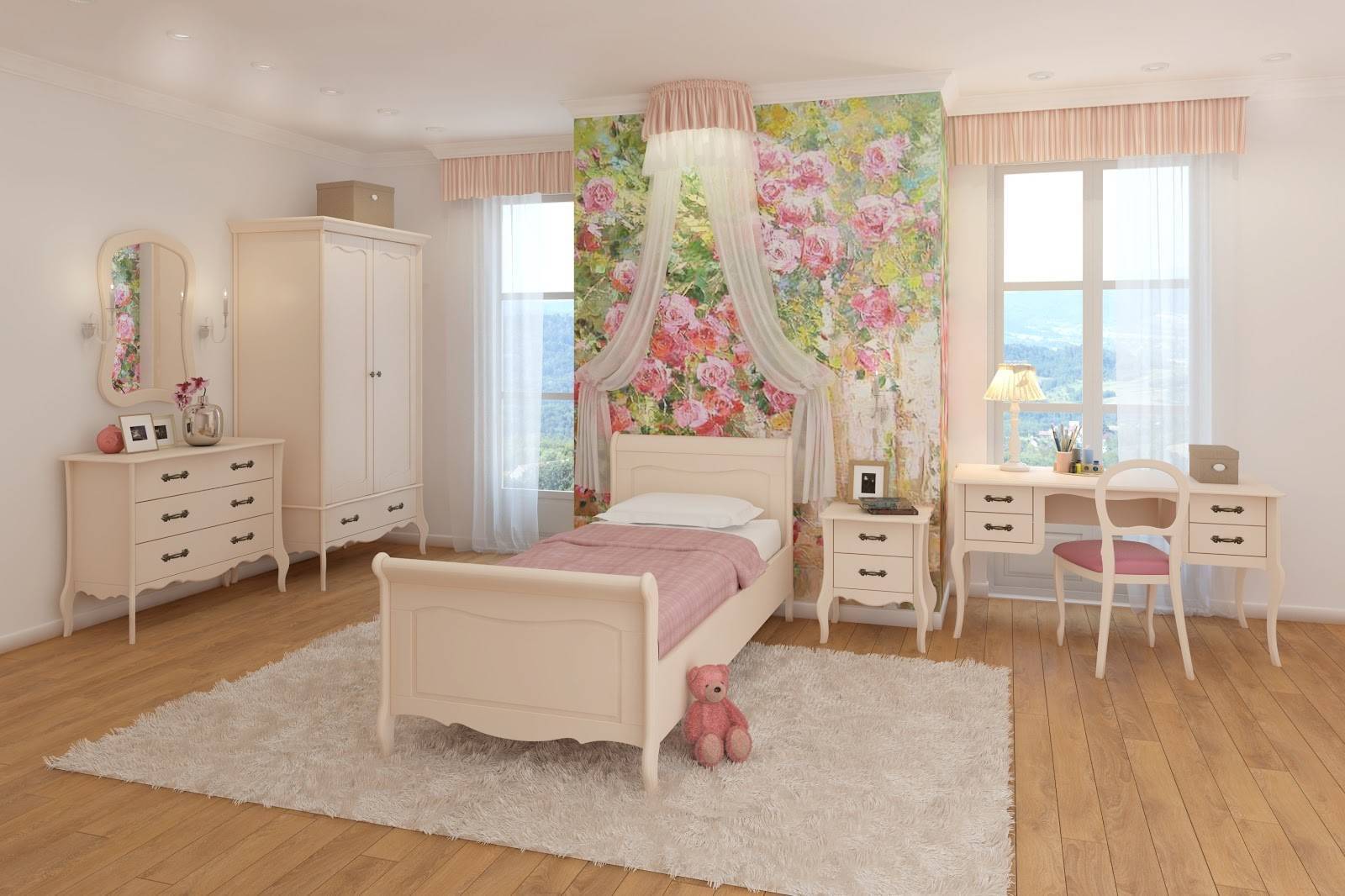 Фотообои с цветочным орнаментом в интерьере комнаты для девочки. Здесь выдержан стиль прованс: светлые стены, цветы, пастель
