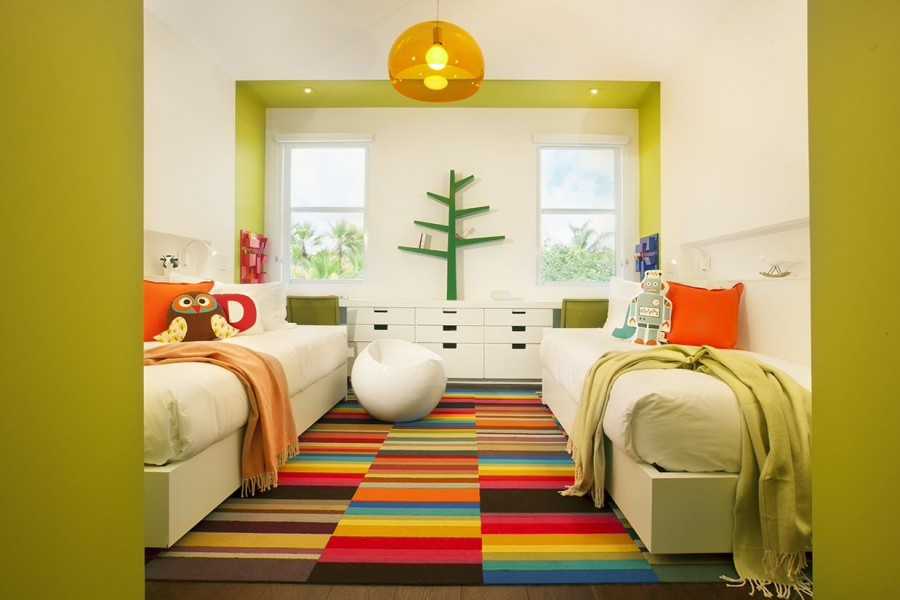 Можно не бояться миксовать, например, желтые подушки с красными светильниками и зеленым ковром — в белом интерьере детской комнаты все это будет выглядеть не аляповато, а живо и сочно.