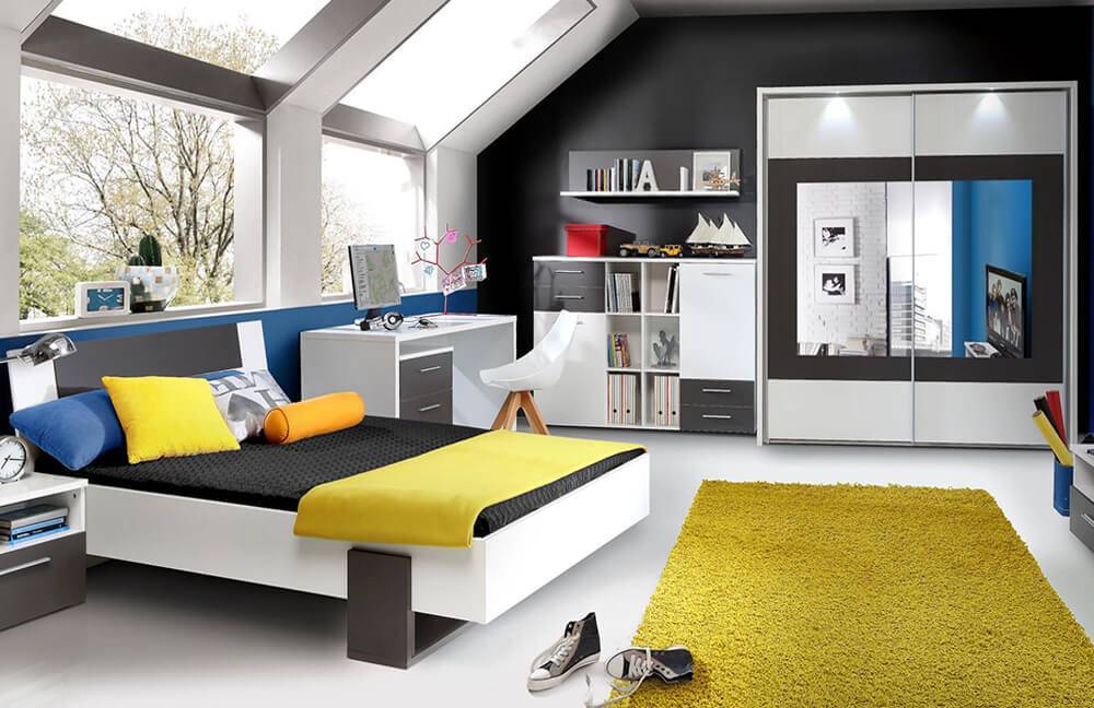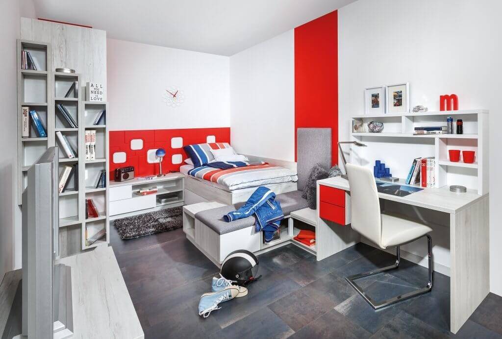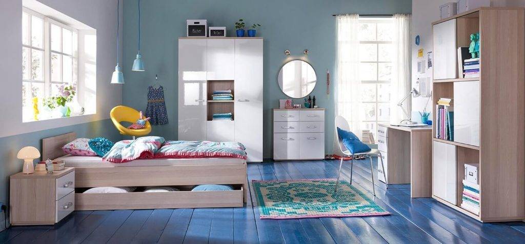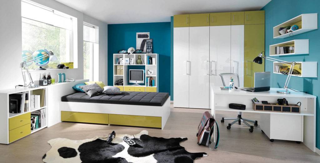 - Для подростка желательно использовать более габаритные конструкции с лаконичным исполнением с расчетом на увеличение внутреннего наполнения. Также при выборе следует учитывать вкусовые предпочтения и пожелания хозяина комнаты.
