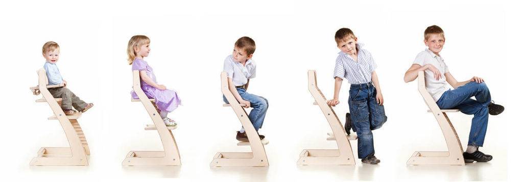 В следующую группу входят «растущие» стулья или трансформеры. Конструкция включает сиденье, подставку для ног, две опоры и небольшую спинку. Первые два элемента можно регулировать по высоте. Для этого на внутренней стороне опорных стоек расположены пазы. Возможность изменения положения спинки отсутствует. Этот стул несложен в использовании, доступен по стоимости и способен служить вашему ребенку длительное время (от 6 месяцев до 15 лет). Однако сиденье у стула-трансформера всегда жесткое, что может вызывать дискомфорт.