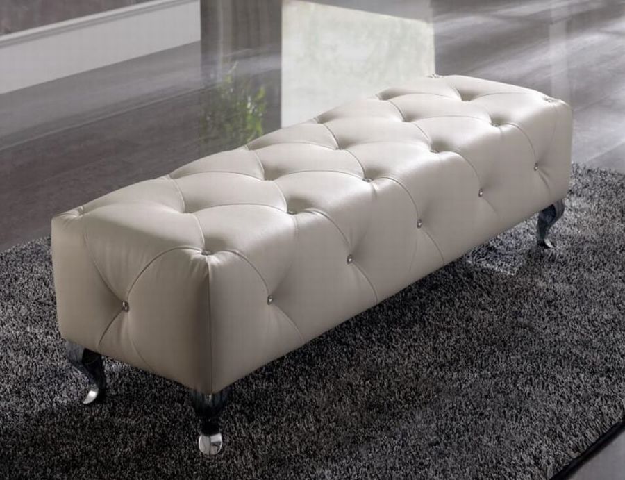Встретить можно и пуфики прямоугольной формы с ножками. Такие пуфики способны выдержать вес двух человек. При этом, материалов на перетяжку уходит меньше.