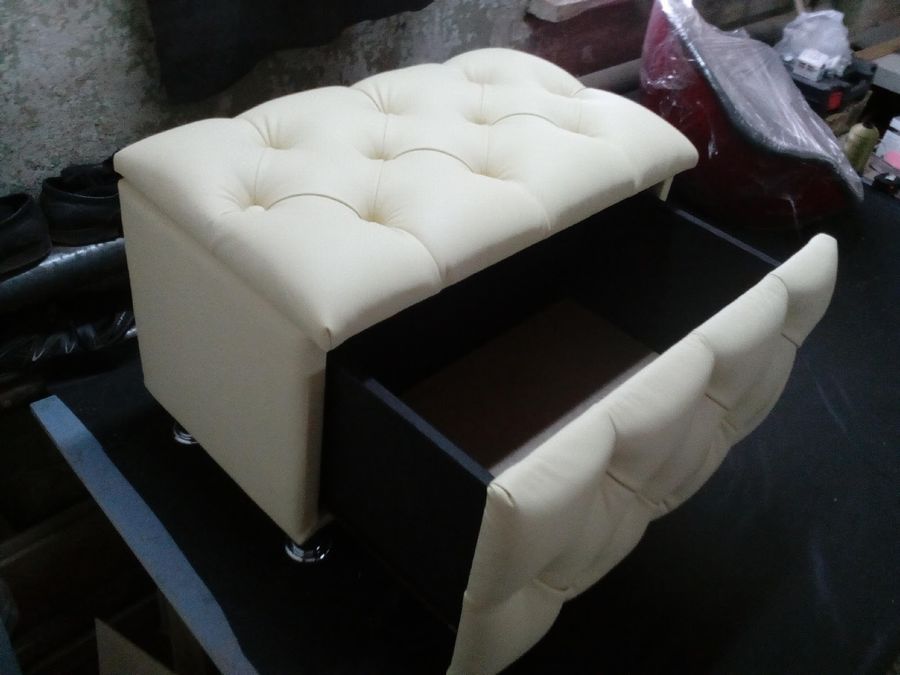 Помимо круглых вариантов пуфика для туалетного столика, обшитого кожзаменителем, встречаются прямоугольные варианты самодельных пуфиков.