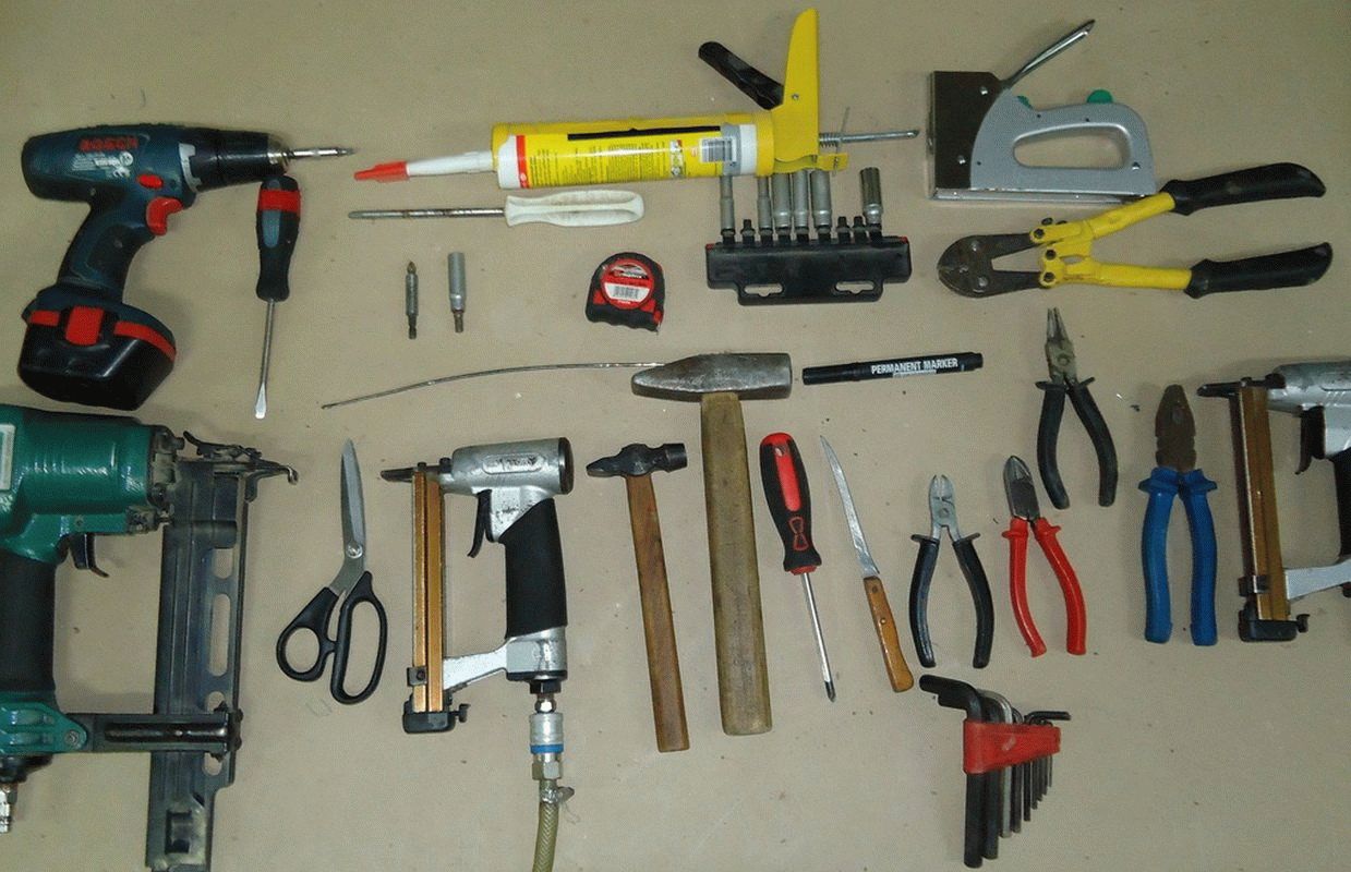 - Стандартный набор мебельщика — электролобзик, дрель, шуруповерт, ключ-шестигранник, отвертки, рулетка, угольник, уровень, шлифовальные инструменты.
