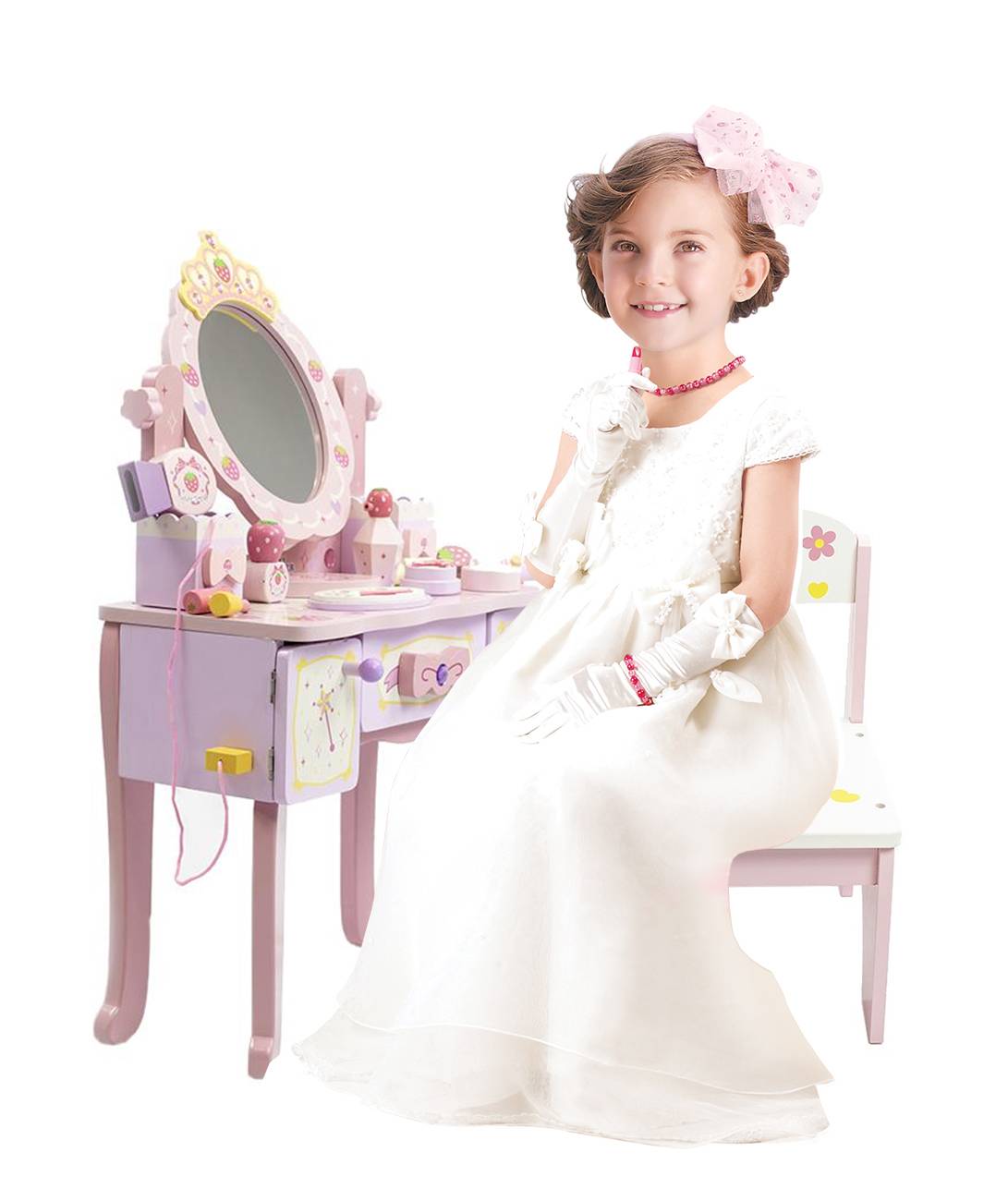 Позже, в 6-7 лет, можно приобрести более качественный и элегантный вариант из древесины, который поможет привить девочке чувство вкуса. Особо интересно выглядят варианты с зеркалом в пол, которые позволяют рассмотреть себя в полный рост. Это удобно, при этом визуально расширяется пространство комнаты.