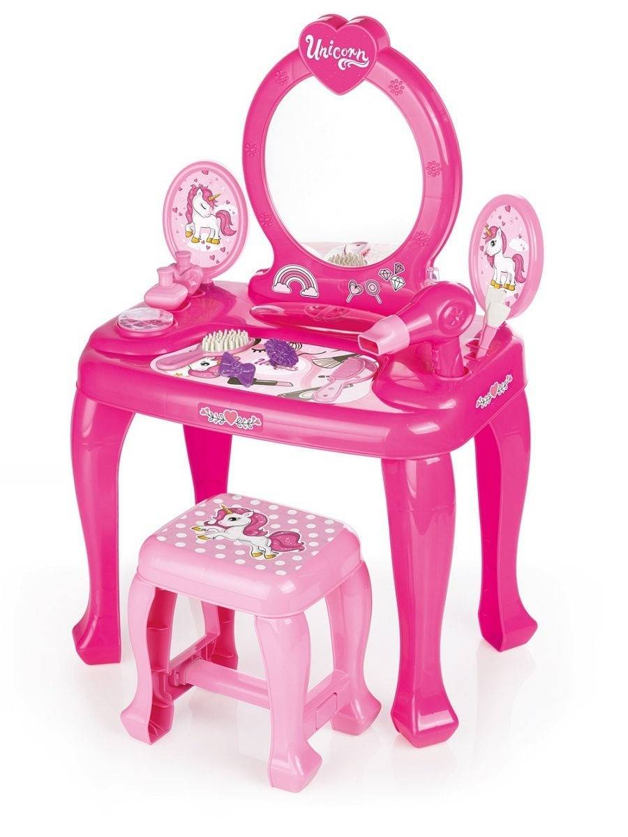 - Столик со специальным оборудованием – это готовый плацдарм для игры в парикмахерскую или для подготовки к великолепному королевскому балу. Такие изделия обычно сразу комплектуются разными наборами косметики, недорогой бижутерией и несколькими игрушечными приборами: феном, плойкой, щипчиками, простым пульверизатором.