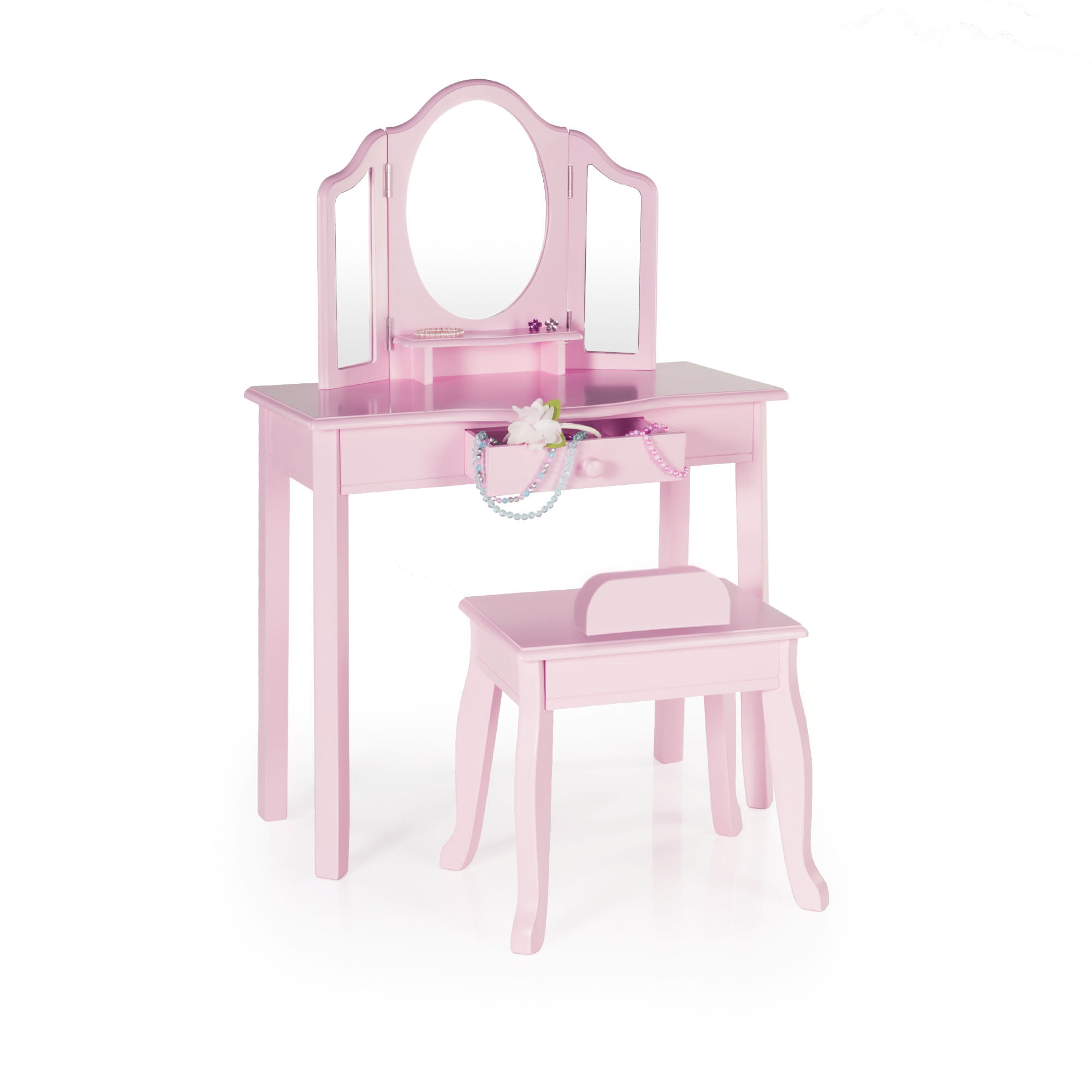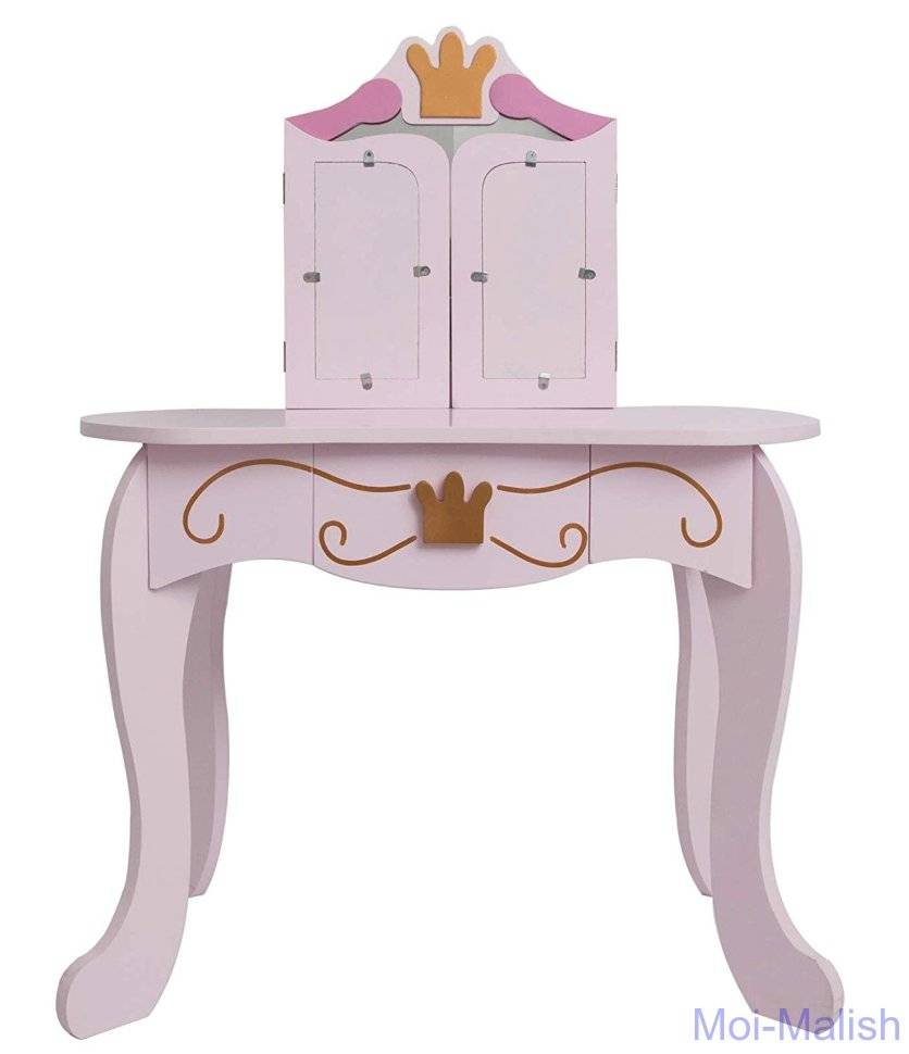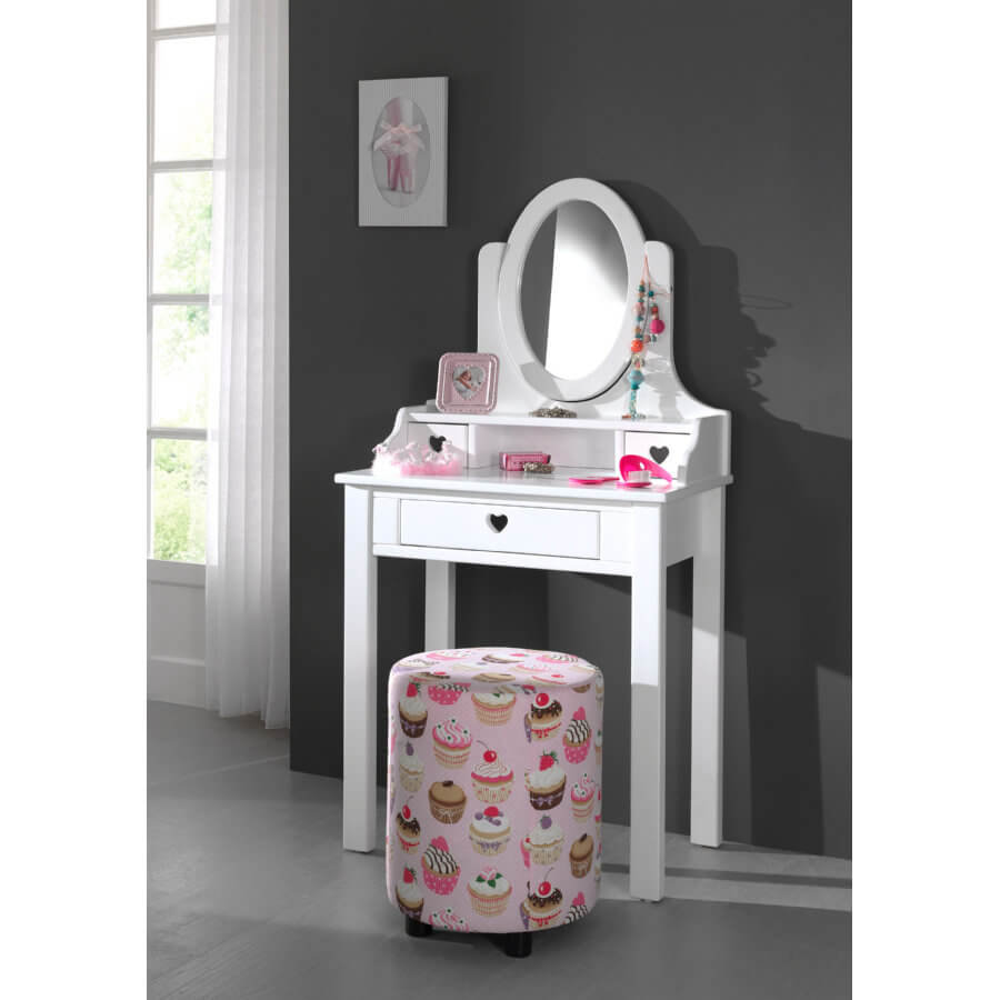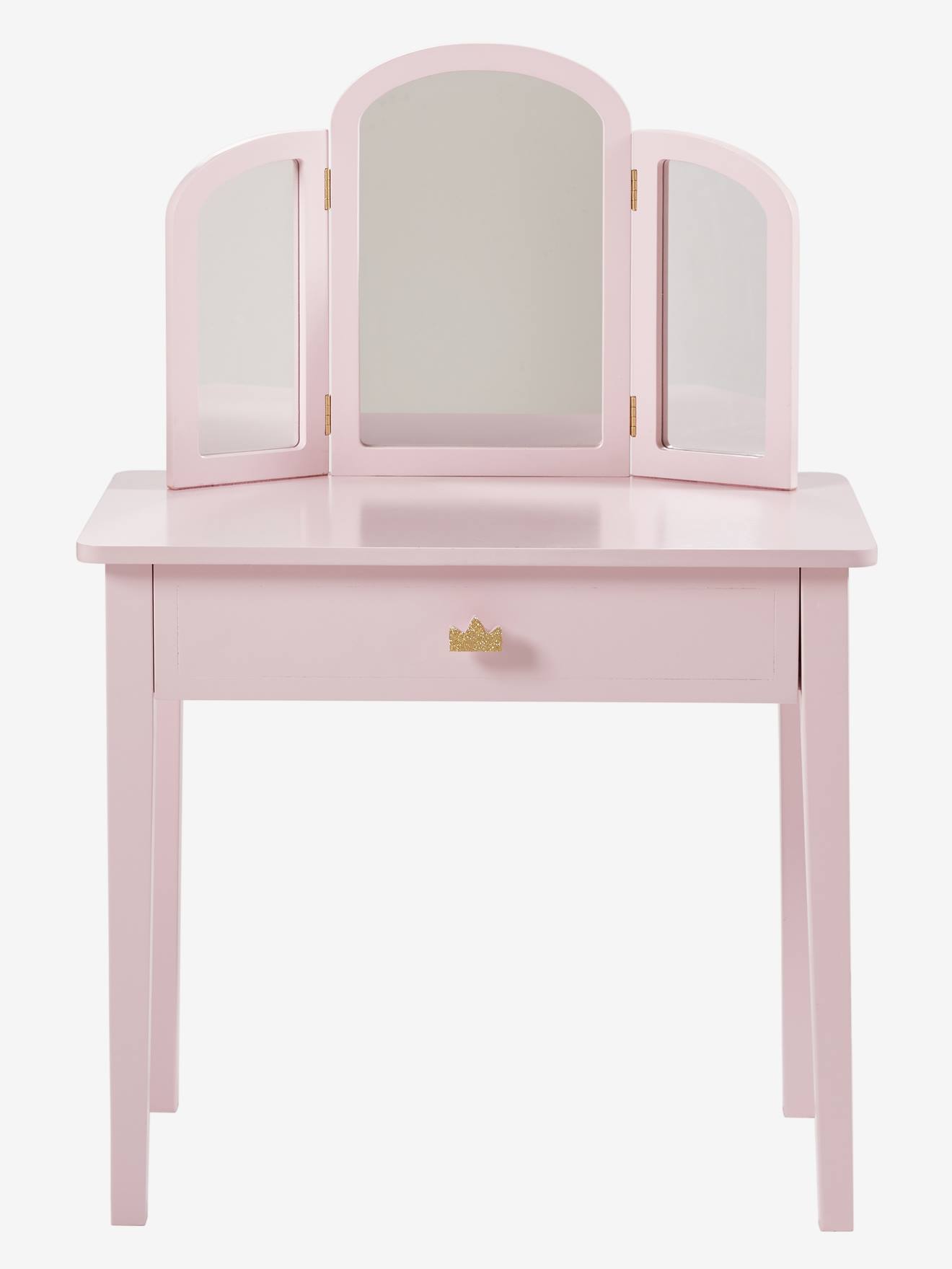 - Модель с зеркалом (см. Туалетный столик с зеркалом: в чем его секрет) – это универсальное изделие для любого возраста. Чтобы обезопасить самых маленьких модниц следует выбирать простые зеркала, где они надежно закреплены к столешнице или c небьющимся полотном из акрила. А для подростков лучшим вариантом будет установка вращающегося псише или с откидным зеркалом бюро, которое можно при необходимости использовать как комод или письменный стол. Самый удачный вариант подскажет сама юная принцесса.