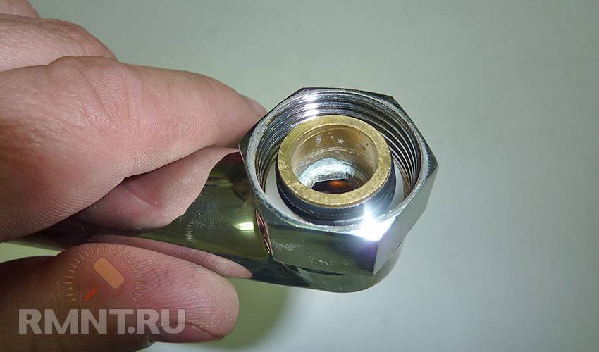 Под ручкой расположена декоративная прижимная гайка. Она выкручивается руками, чтобы не повредить резьбу и наружную поверхность. Под ней находится декоративное кольцо и стандартная гайка (некоторые модели Ukinox или Кайзер для ванной и Ledeme для кухни такой деталью не оборудованы).