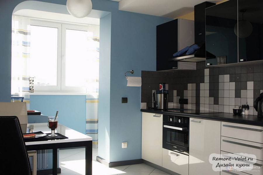 Полезной площади много не бывает. Преобразование оконного проема при объединении площадей позволило пропустить больше естественного освещения в кухню с нежно-голубыми стенами. Это пример ярких монохромных решений. Динамика оттенков серого в плитке фартука, глянцевые белые и черные фасады.