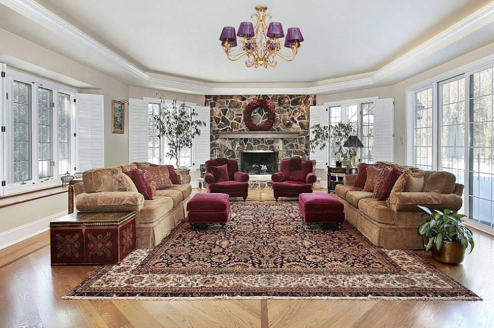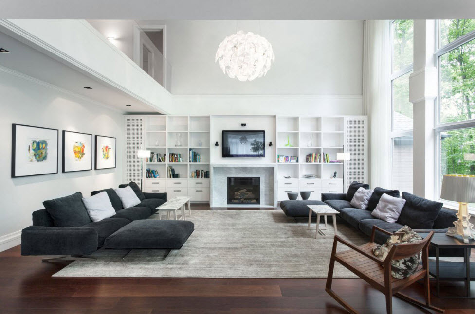 Самый популярный – расположить мягкую мебельную группу подальше от стен комнаты. Взгляд будет цепляться за предметы мебели, границы комнаты растворяться, и помещение не будет казаться таким огромным и театральным. Кстати, большая комната – это именно тот случай, когда в размерах мебели можно себя не ограничивать.