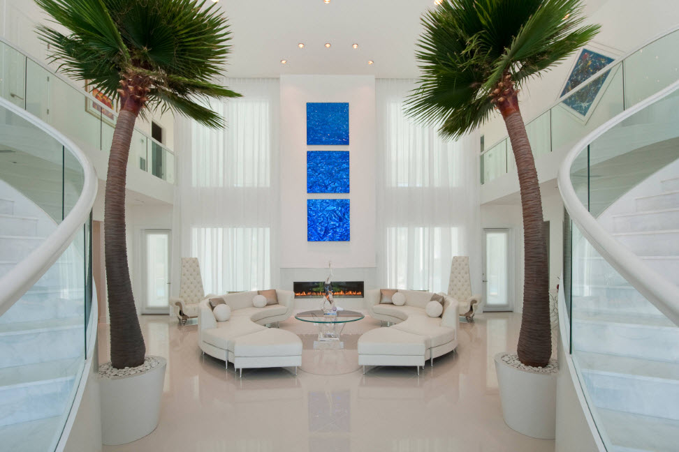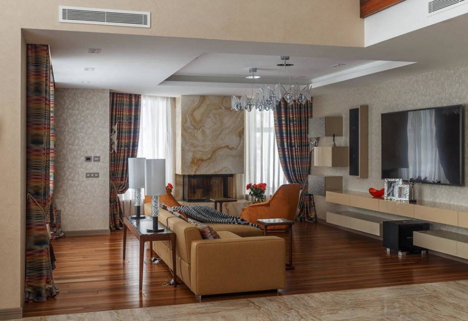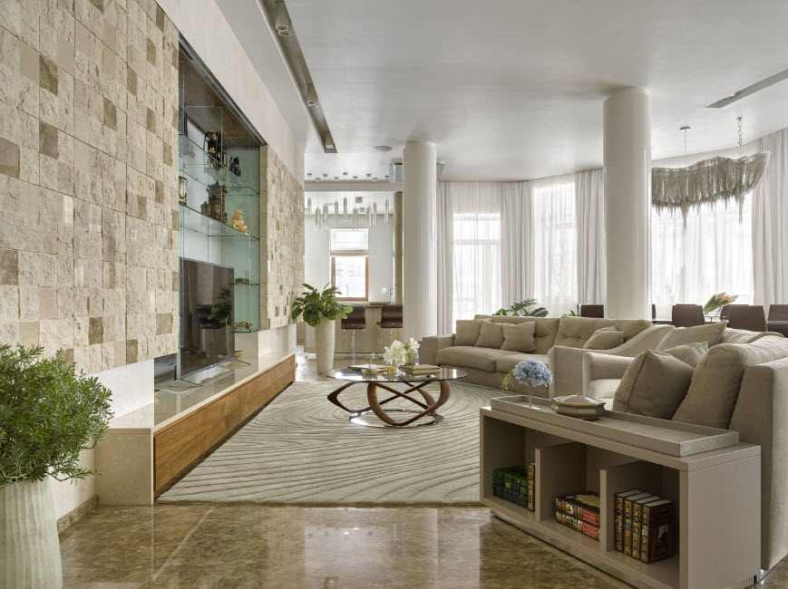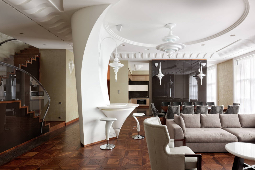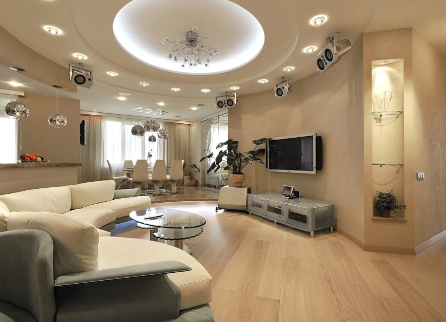 Большая длинная гостиная украшена многоуровневым потолком округлыми ступенями. Диваны в одном стиле, но разных цветов рассчитаны на большое количество гостей.