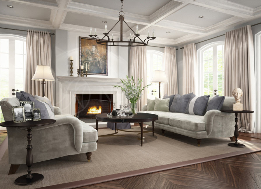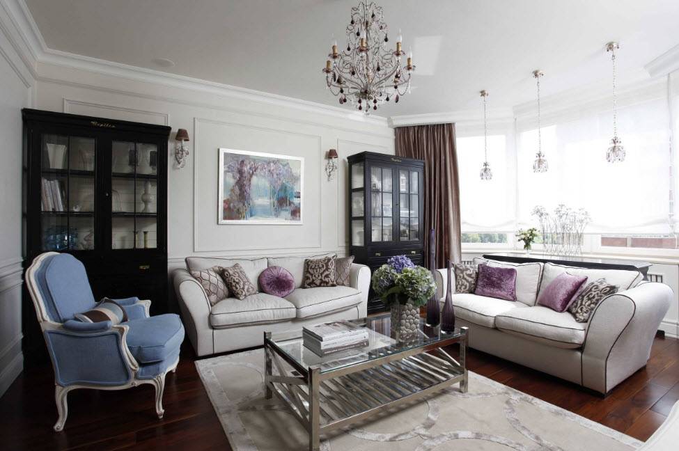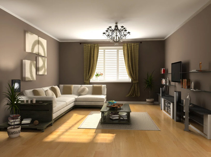 Гостиная без балкона – ее особенность в количестве и размере окон. Для плохо освещенного помещения подойдет идея приглушенной атмосферы уединения. Вопрос темной комнаты может быть решен комбинацией светлых тонов с большим количеством искусственного освещения.