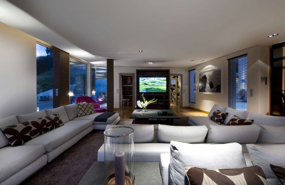 Светлая большая комната с большим диваном и большой застекленной стеной и дверью может быть предназначена для больших компаний. Диван, который рассчитан на то, что на него могут прилечь сразу несколько человек, помогает создать непринужденную обстановку.