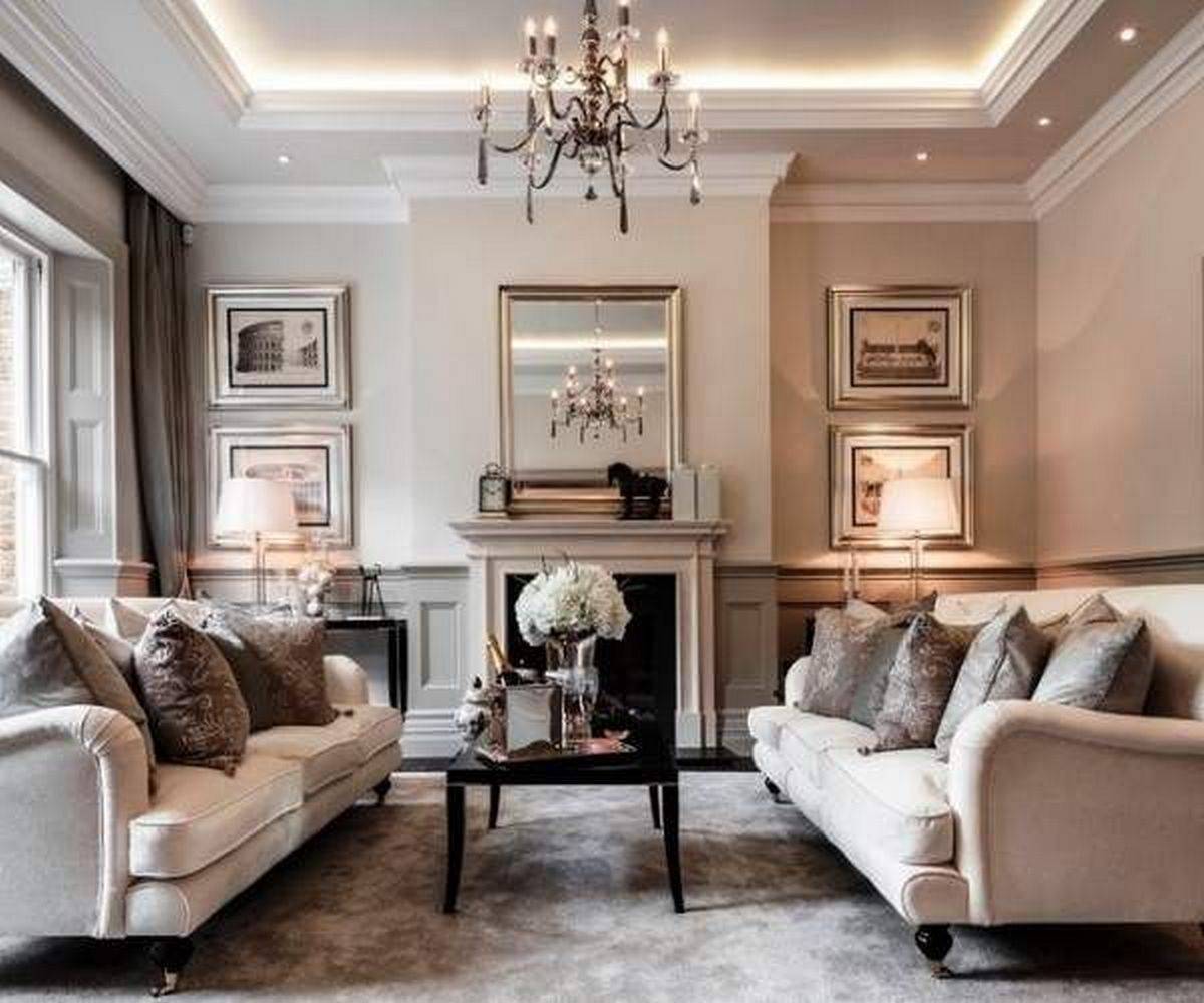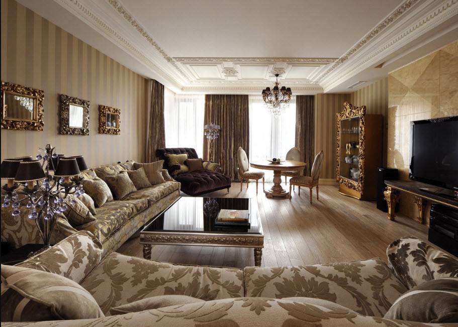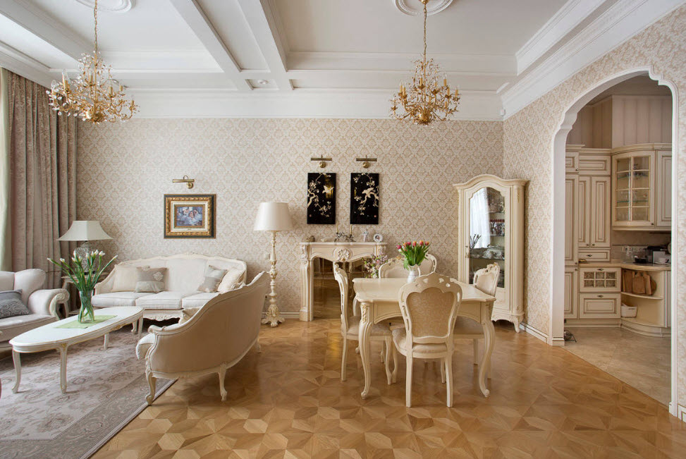 На оформление помещения в этом стиле обычно уходит много средств. Двери, напольное покрытие и корпусная мебель должны быть сделаны из натуральной древесины, мягкая мебель – из кожи или кожзама. Обязательные элементы интерьера: хрустальная люстра, лепнина на потолке, позолота на мебели, изысканная форма фурнитуры. Главное, при расстановке мебели не забывать про симметрию. Для оформления стоит выбрать тёплые светлые цвета: песочный, кремовый, персиковый.
