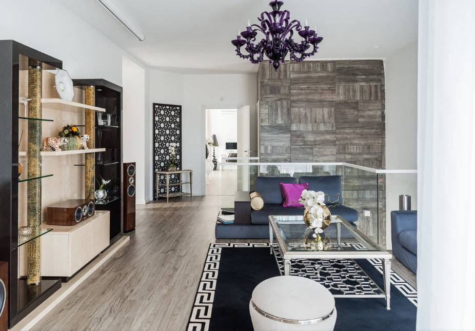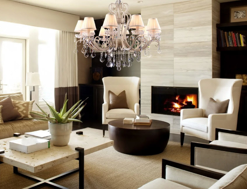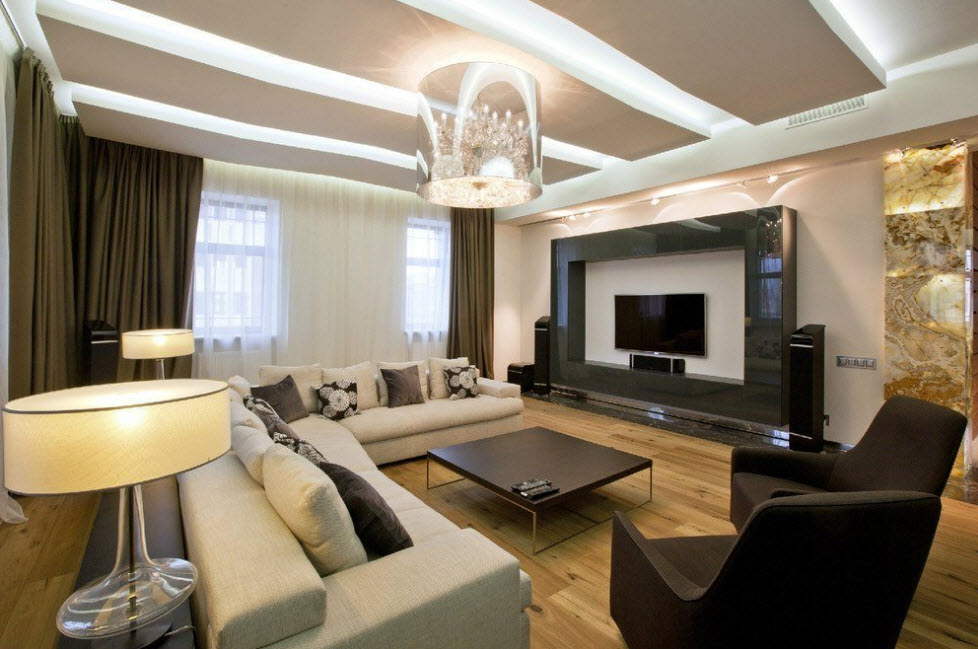 Не слишком дорогим удовольствием будет дополнение потолка оригинальной, современной люстрой. Этот элемент является достаточно заметным в интерьере гостиной, поэтому пренебрегать этим не стоит.