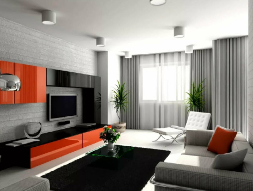 Лучшим вариантом для создания современного дизайна гостиной в хрущевке станет стиль минимализм. Его отличительные особенности: отделка стен, потолка и пола материалами однотонного цвета (обычно белого), минимальное количество мебели, выбор компактной мебели строгой формы, отсутствие на ней украшений. Основные цвета этого стиля: белый, серый, кремовый, бежевый, коричневый, жёлтый. Чёрный и другие тёмные цвета можно использовать только в небольших деталях интерьера: подушки, полки и другое. Посмотрите на реальные фото современного дизайна гостиной в хрущевке.