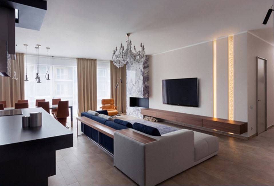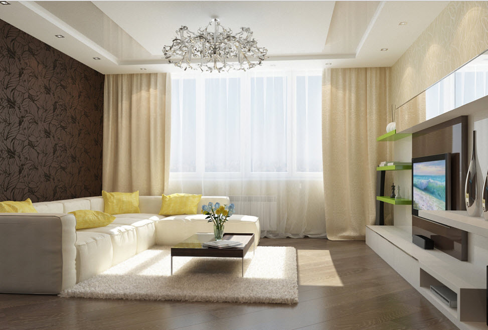Планировка обычных городских квартир чаще всего имеет прямоугольную форму гостиной. Сильно вытянутая комната требует особого подхода. В этом случае разместить необходимую мебель и не загрузить пространство в 19 кв. метров довольно сложно. Простота и минимализм помогут справиться с поставленной задачей. Предпочтительно использовать низкую, узкую мебель, оформление в светлых тонах с добавлением мелких монохромных элементов. Белый потолок, окрашивание противоположных стен в разные цвета зрительно расширяют помещение. Из более кардинальных решений есть варианты совмещения гостиной с кухней или спальней.