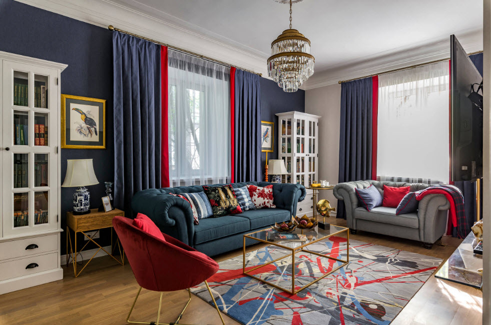 Яркие красные занавески и коврик на фоне темного дивана и журнального столика