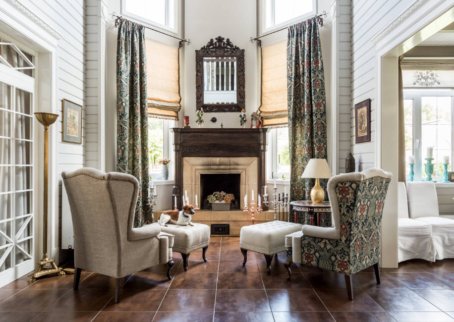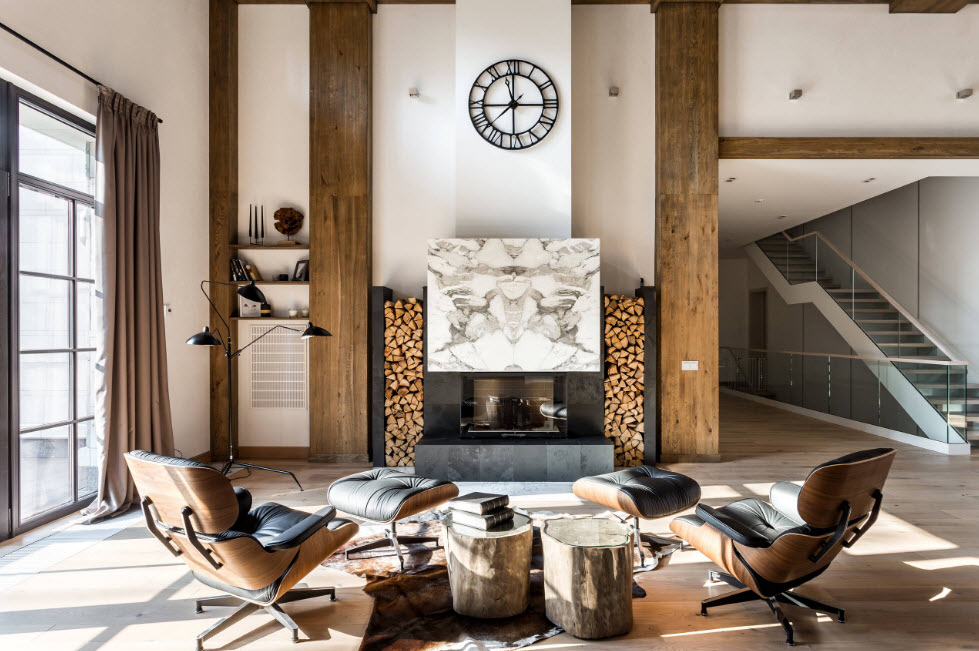 Большая комната в деревянном доме – это уже стильно. Столик в виде сундука, камин и окна в форме терема создают ощущение старины и природности.