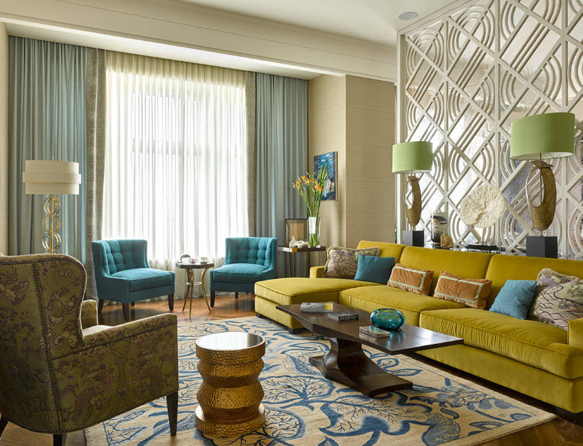 Настоящей находкой для дизайнера будет гостиная с несколькими окнами, выходящими в разные стороны. Достаточное количество света позволит применять разные цветовые решения, использовать разнообразный отделочный материал. В таком случае подойдут и яркие оттенки, и более темные спокойные цвета.