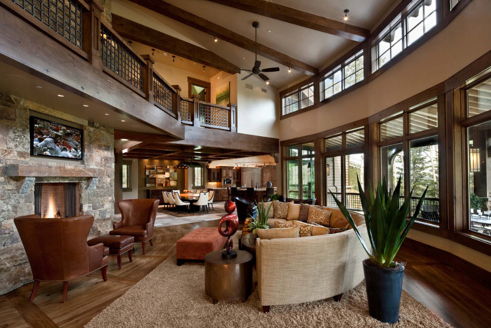 Дизайн большой комнаты на фото выполнен в стиле рустики. Дерево в оформлении и огромный камин, мягкие диваны и кресла, несмотря на большие размеры комнаты, создают ощущение тепла и уюта.