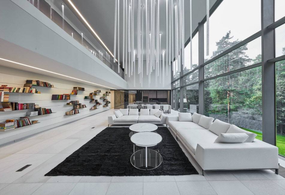 На фото огромная комната высотой в два этажа с несколькими одинаковыми диванами в одной части комнаты и длинным столом с креслами – в другой.
