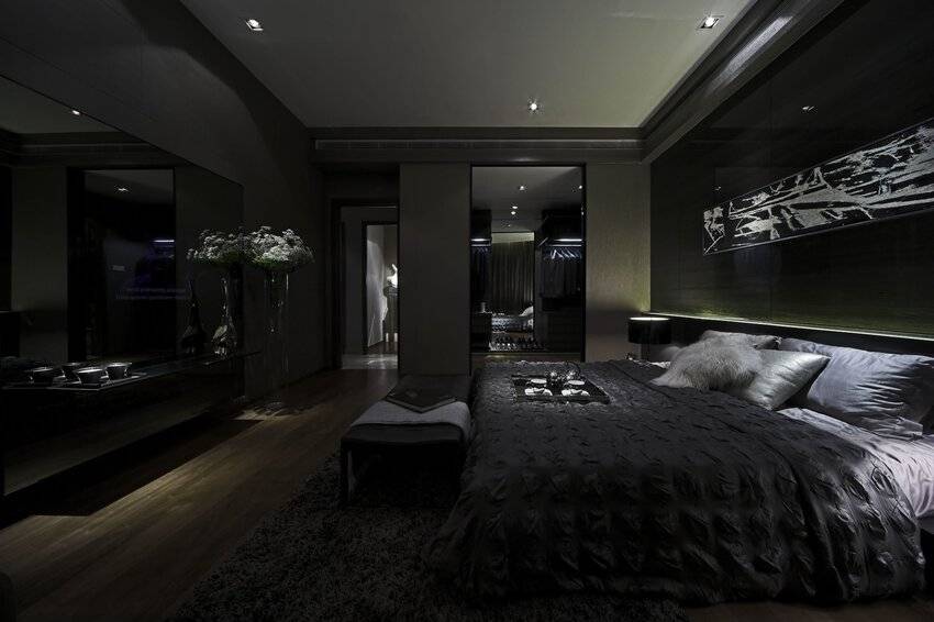 Дизайн строгой черной спальни диктует использование нескольких источников света разной силы, а не одну люстру, светящую в едином режиме в центре комнаты.