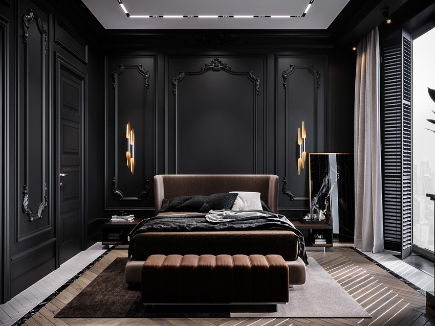 Подходящие стили. Лучше всего в интерьере темной спальни, смотрится черный, когда использован стиль модерн, минимализм и арт-деко. Если хотите оформить спальню в классическом стиле, используйте черно-белое сочетание цветов.