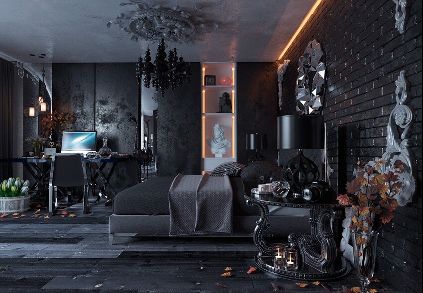 Важно использовать в помещении несколько разных оттенков темного цвета. Например, потолок лучше делать на несколько тонов светлее стен, а каждый предмет мебели не должен сливаться с отделкой оформления комнаты