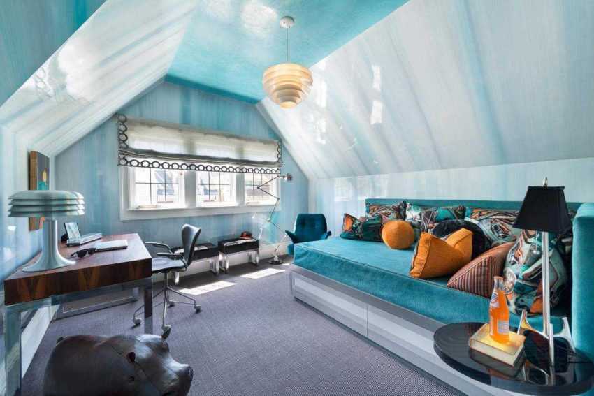 Сочный, но неяркий синий цвет благородного камня – сапфира, является основным. На его фоне выгодно смотрятся припыленный голубой, коричневый, темное серебро, темный или средней интенсивности серый. Декоративные детали могут быть выполнены в белом цвете, но они должны быть максимально мелкими (напр., мелкий рисунок на обоях или покрывале, картины на стенах с монохромным белым рисунком).