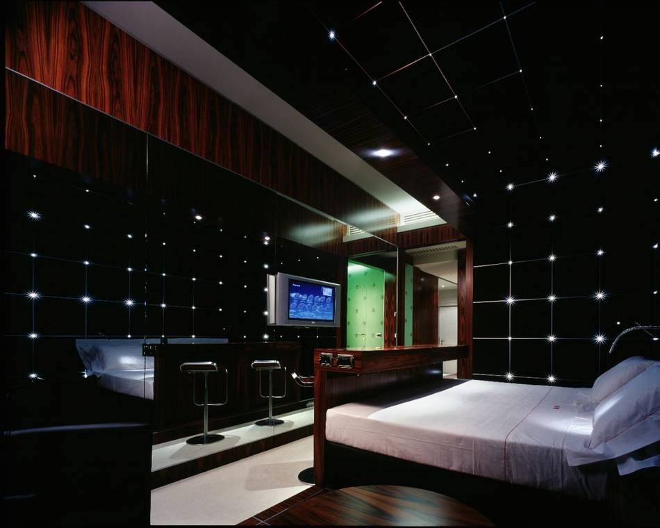 Известный итальянский дизайнер Фабио Новембре предложил оформить спальню в гостиничном номере стеклянными стеновыми панелями с тонировкой. Главная идея дизайна заключается в размещении источников освещения в промежутках между панелями, которые подчёркивают контуры. Свет очень тусклый, чтобы не бить по глазам, но заметный, он является главным источником освещения спальни.