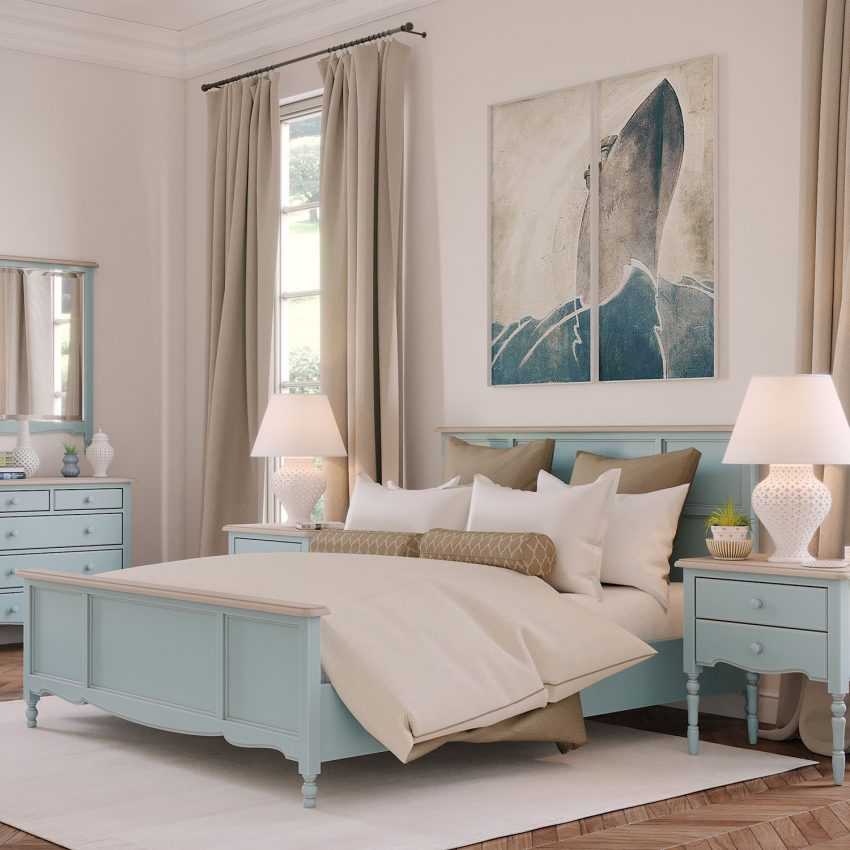 Нежный и тонкий синий в сочетании с белыми аксессуарами (в итоге получается своеобразная бело-голубая спальня) – самый распространенный выбор, и он действительно выглядит со вкусом. Пастельные тона стен в дуэте с оттенками голубого добавят интерьеру характерной легкости. В сочетании с белой, потертой мебелью можно создать неповторимую идиллическую атмосферу.