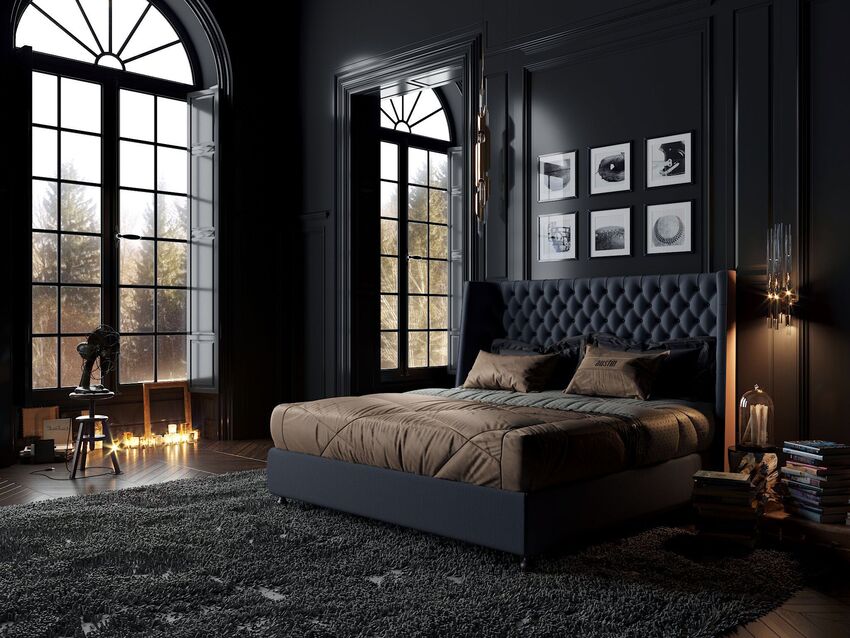 Космос кажется таинственным и затягивающим, а темная мебель, особенно с бархатной обивкой, как бы поглощает пространство комнаты. Это вариант для больших помещений с зонированием. Продуманный дизайн черной спальни, напротив, чем-то притягивает, и в нем нет чего-то негативного.