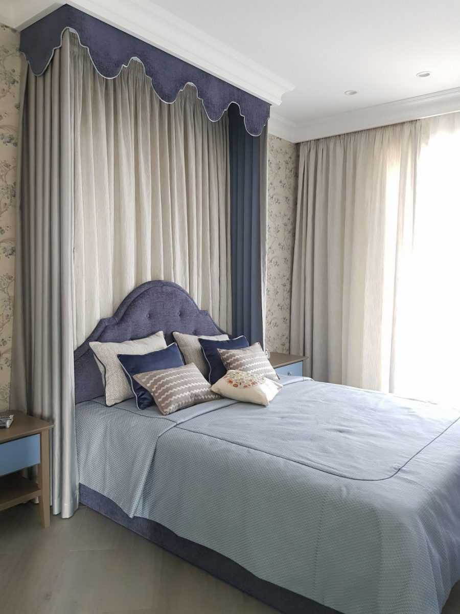 Однотонная синяя спальня разбавлена серыми портьерами и кроватным покрываломИсточник suncityvillas.com