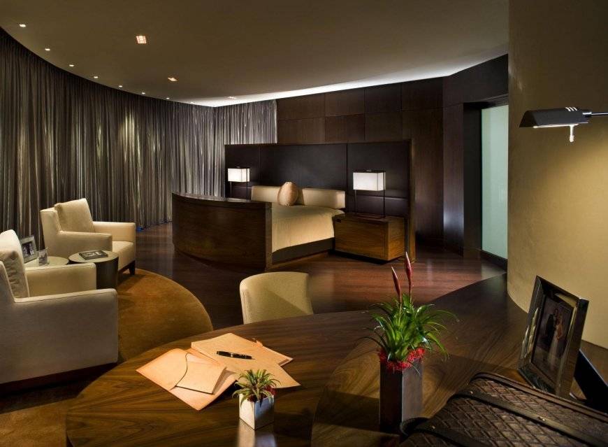 В спальне с темной мебелью и отделкой зонировать лучше всего при помощи нескольких приемов: