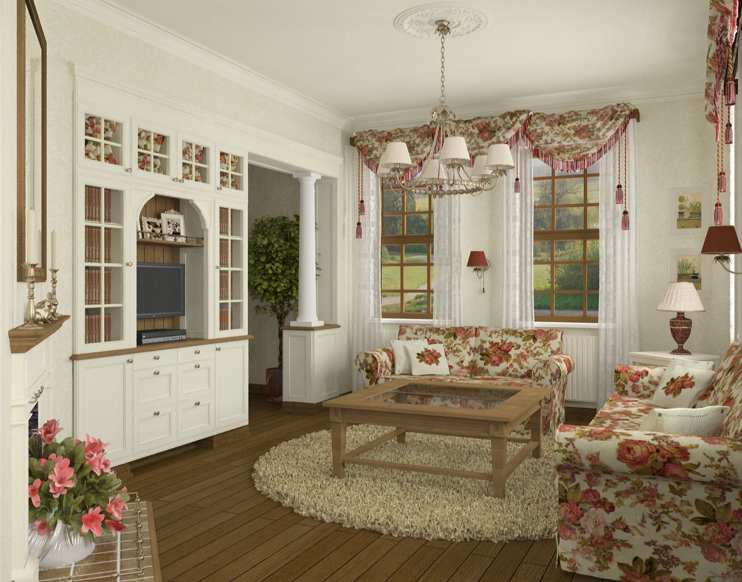 В гостиной деревенский стиль в интерьере фото, которого представлено ниже, предполагает оформление помещения аналогично кухне. То есть, потолок покрываем побелкой либо окрашиваем белой краской. Для стен приобретаем обои с растительным узором в зелено-коричневой палитре. Окно декорируем ажурными занавесками, доходящими до середины окна. На подоконниках должны располагаться вазоны с живыми цветами.