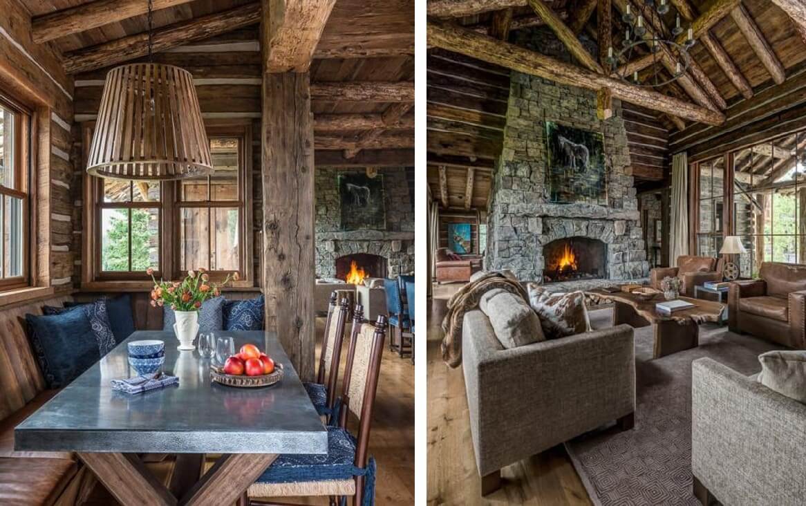 Интерьер в стиле шале можно создать только в дачном интерьере доме с камином и отделкой из бревна и камня. Он должен быть похож на просторное жилище пастуха, поэтому здесь есть анималистичный декор, выступающие козырьки, мансарда из бруса, грубая и плетеная мебель, рукодельный текстиль, глиняная посуда.