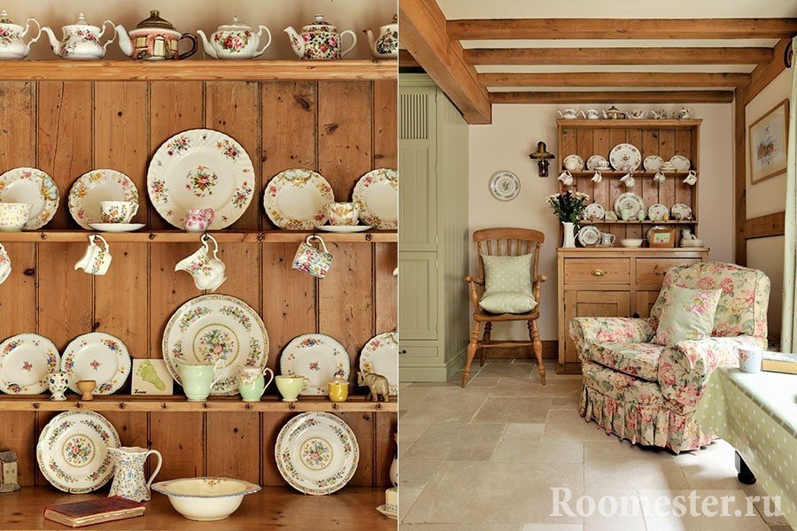 Каждой стилевой разновидности деревенского интерьера соответствуют определенные материалы, из которых изготавливается повседневная либо декоративная посуда. Светлая керамика и начищенная медь главенствуют в провансе, глиняные изделия в русском стиле, узорный фаянс придает очарования домашней обстановке английского направления.