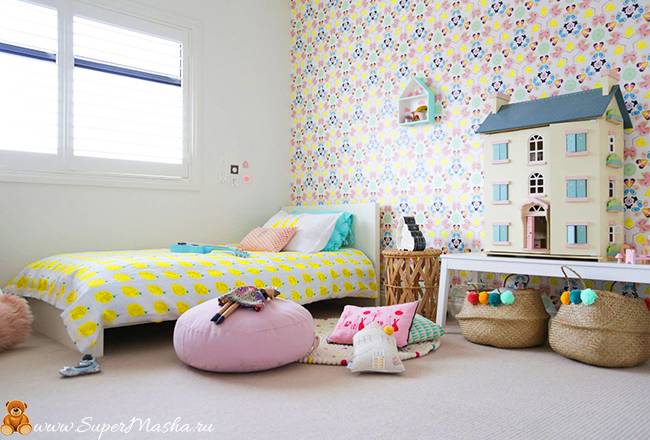 В этом возрасте обои в детскую комнату для девочек можно выбирать с героями мультиков, крупными цветами, животными. Будет хорошо, если вы запланируете сцену в детской комнате. Дети обожают выступать и играть в театр.