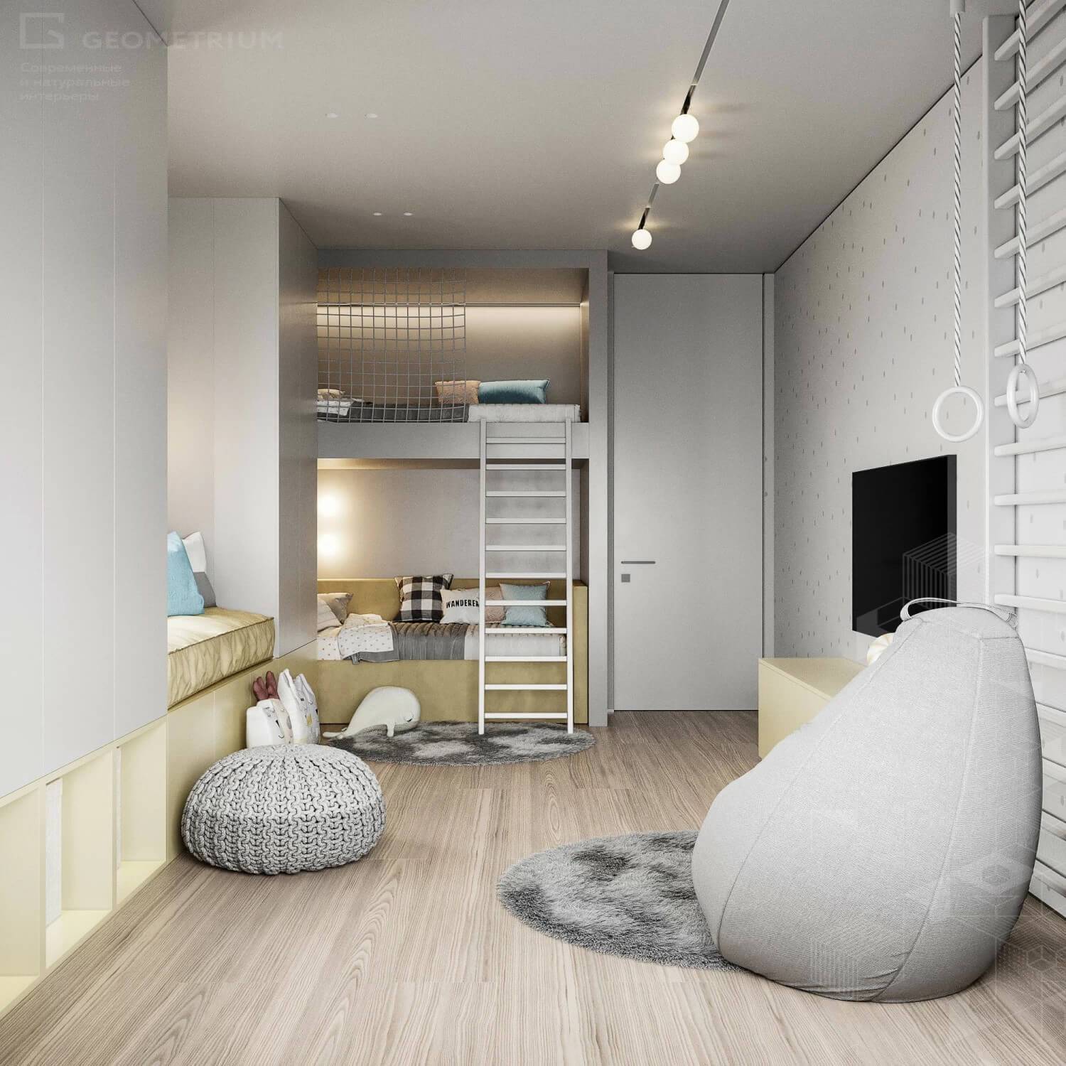 Шведская стенка с кольцами — незаменимая вещь для активного, подвижного ребёнка. С помощью этого нехитрого снаряда можно выполнять десятки полезных упражнений. Проект интерьера в современном стиле, ЖК «Академика Павлова», дизайнер Павел Герасимов