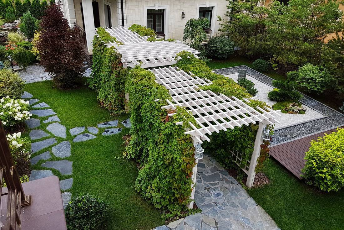 Зелёную красоту создают не только горизонтально, но и вертикально: беседки, арки, сварные конструкции и заборы оплетают лианы или плетущиеся культуры.