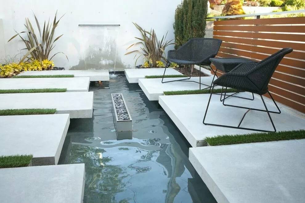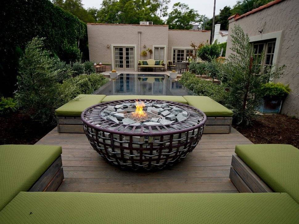 Еще одно интересное решение – огонь и вода. Новой смелой тенденцией ландшафтного дизайна становится сочетание во дворе двух стихий: воды и огня. С их помощью получают фокусные точки, а двор становится эксклюзивным и очень интересным.