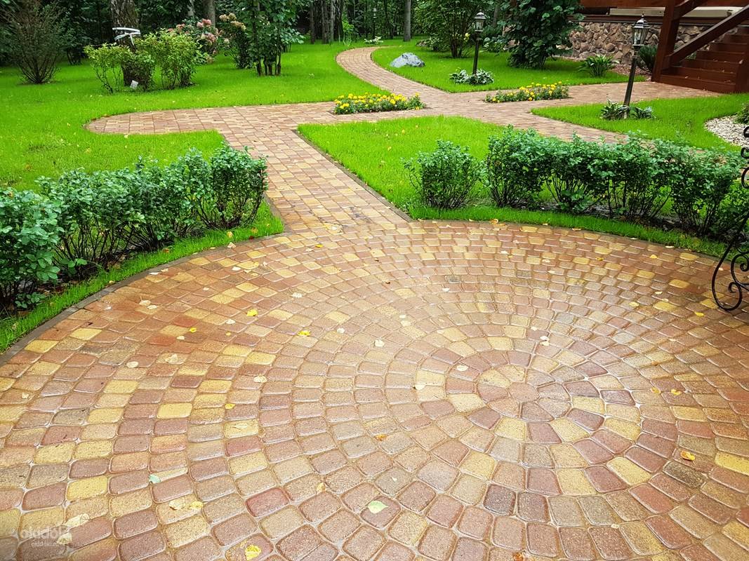 Сегодня дизайнеры все чаще стали использовать брусчатку, чередующуюся с камнями круглой формы.